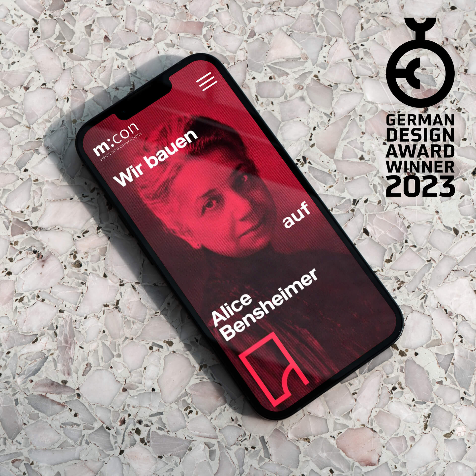Wir sagen Danke an das Team der m:con - mannheim:congress GmbH für die vertrauensvolle und erfolgreiche Zusammenarbeit. Ein weiteres Dankeschön möchten wir der Type Foundry Lineto aussprechen, für die Bereitstellung der Schrift Riforma Rosengarten, mit unserer Modifikation des Minuskel-A und Majuskel-A. Ebenso danken wir dem Rat für Formgebung - German Design Council und der Jury für diese Auszeichnung.